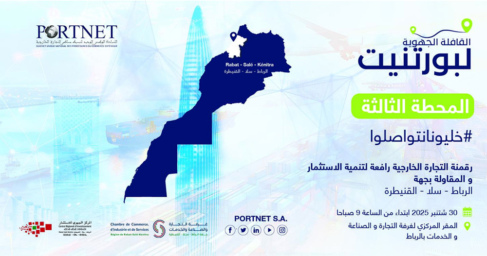 في إطار استراتيجيتها الوطنية القائمة على سياسة القرب من الفاعلين الاقتصاديين، تنظم شركة بورتنيت المحطة الثالثة من قافلتها الجهوية بجهة الرباط – سلا – القنيطرة، وذلك بشراكة مع غرفة التجارة والصناعة والخدمات للجهة، والمركز الجهوي للاستثمار، والمندوبية الإقليمية للتجارة والصناعة بالرباط.