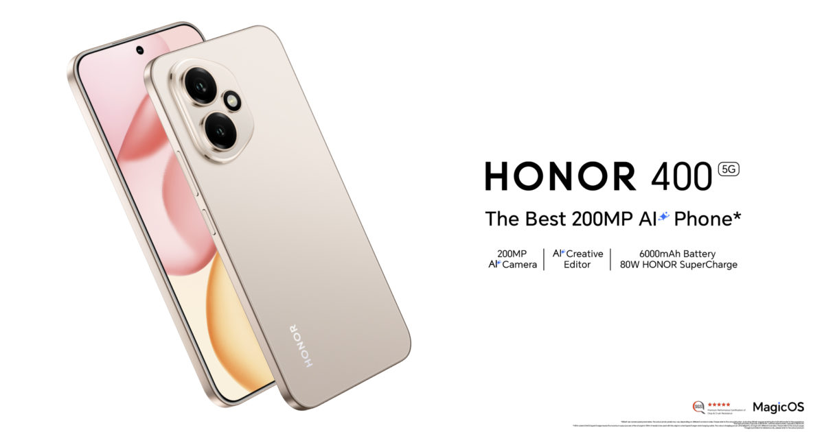 Le HONOR 400 se distingue par son appareil photo principal 200MP avec IA, sa batterie nouvelle génération 6000mAh en silicium-carbone avec une charge ultra-rapide de 80W HONOR SuperCharge, et sa résistance certifiée IP66 à l’eau et à la poussière.